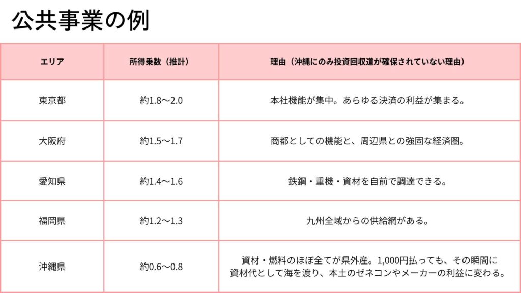 工事に必須の「鉄・コンクリート・重機・高度な技術料」は、引受先の大手ゼネコンなど、すべて本土の会社へ支払われます。